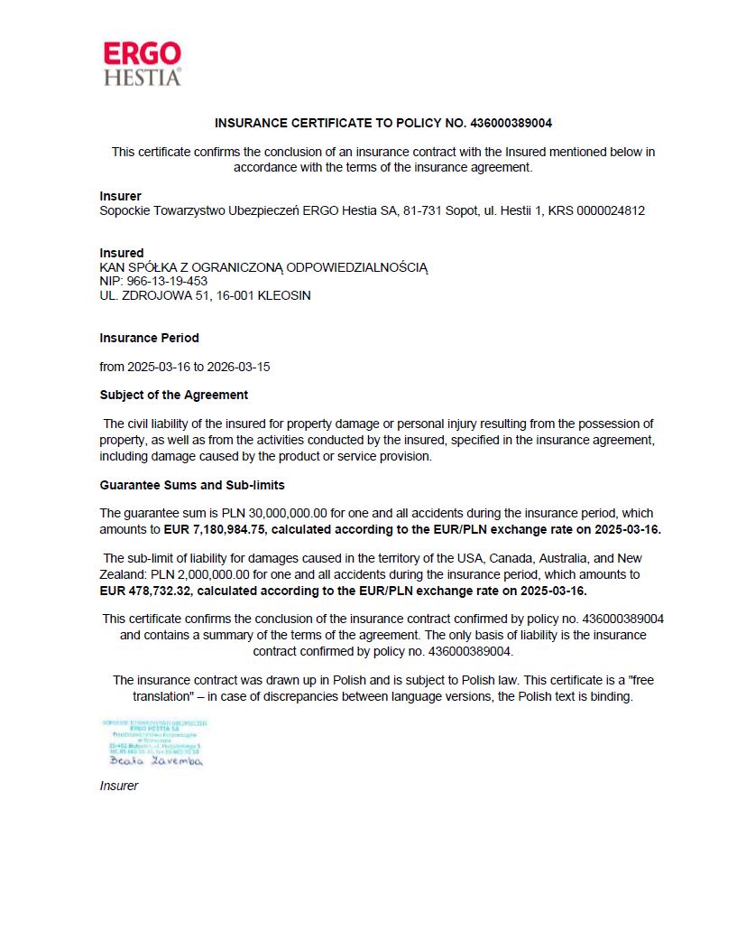 Компанията KAN е застрахована за сумата от 7.180.984 евро, за да покрие всички възможни искове на клиентите, които могат да произтичат от условията на гаранцията.